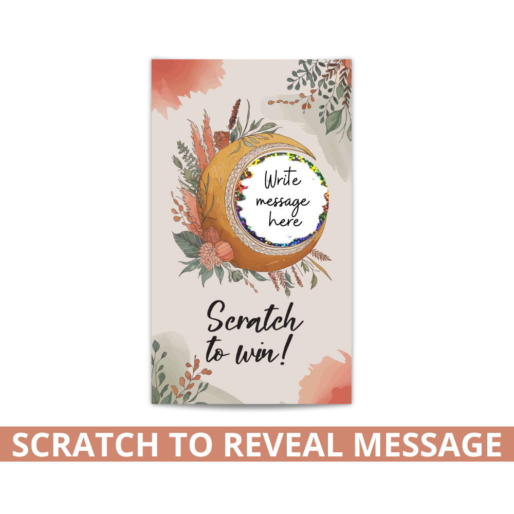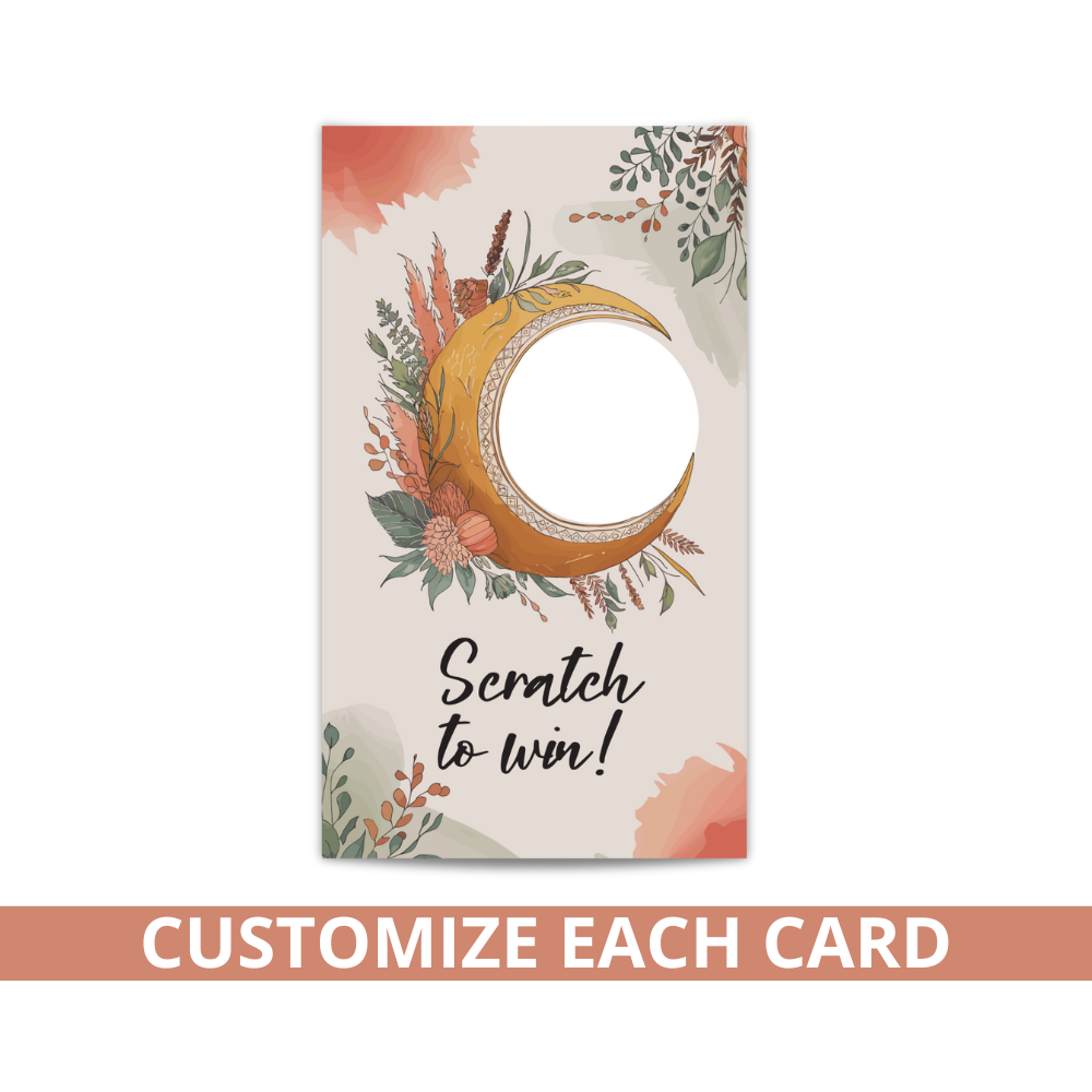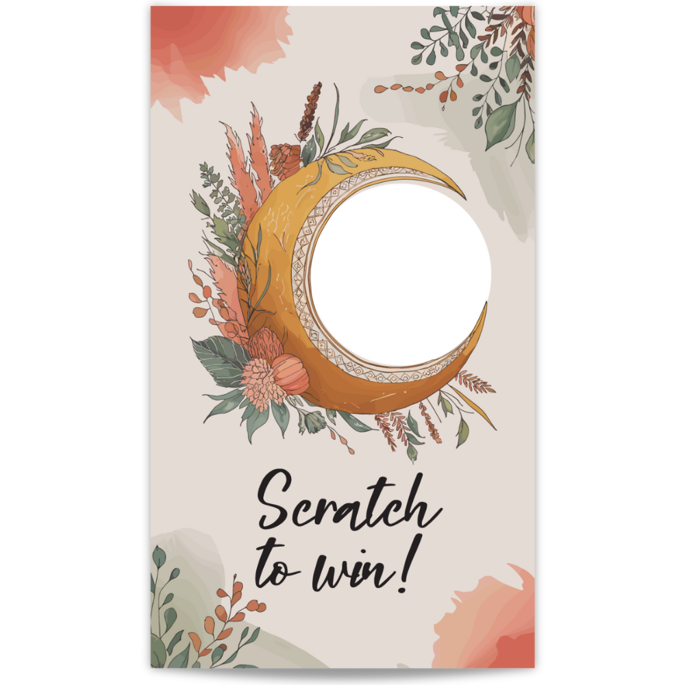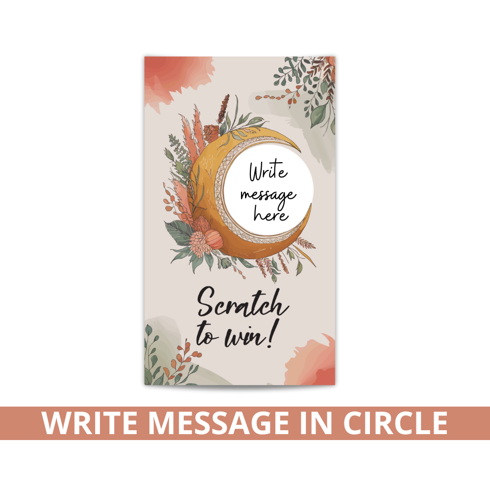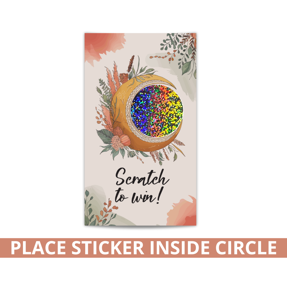 HOW TO USE: You will receive the cards with a blank circle on the card, this allows you to write on the card and give your customer ANY prize you choose! After you have written the prize in the white circle, you can then place your scratch-off sticker over it. The back of this card will be blank to allow you to write a personal note / and or thank you to your customer!